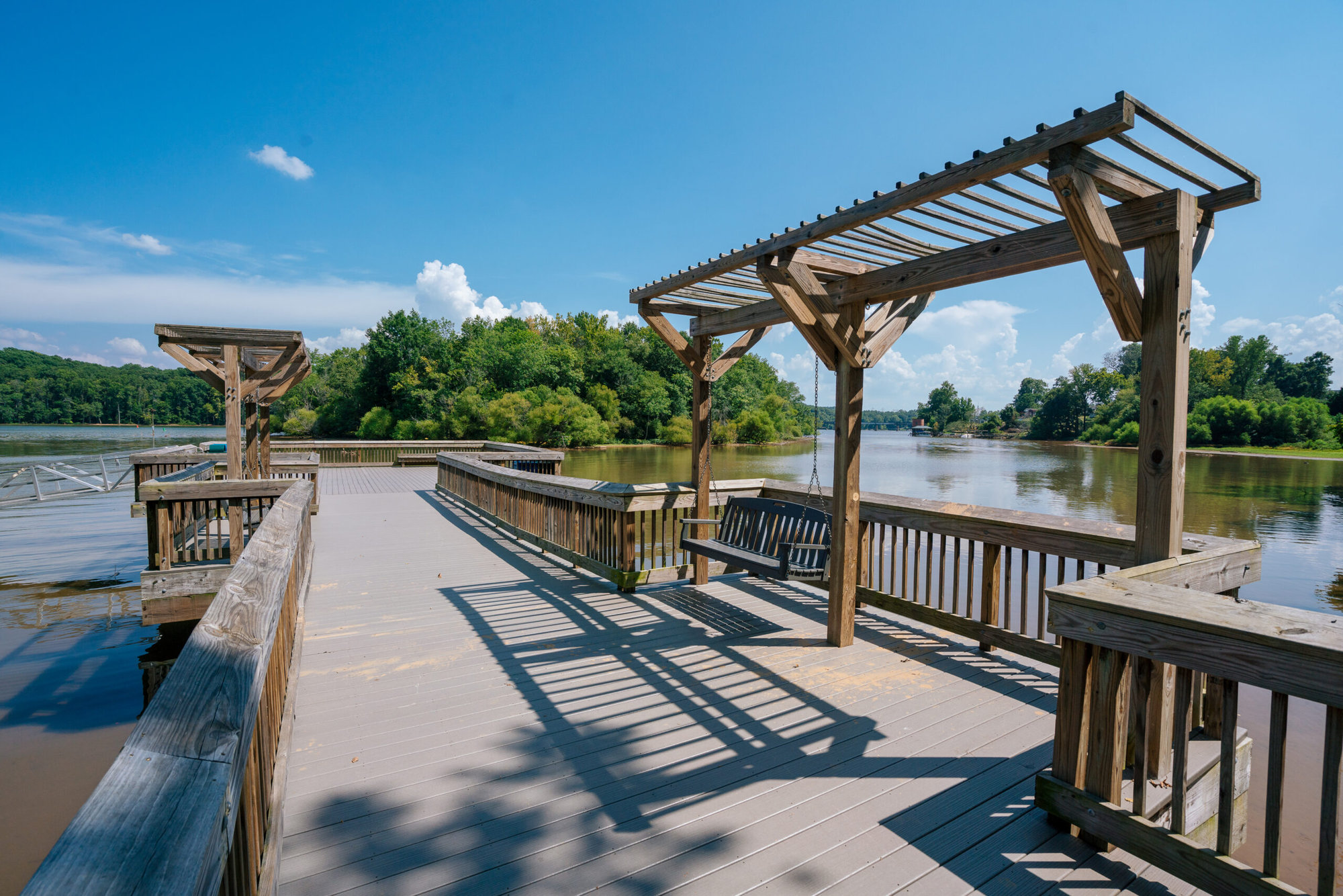 Kevin Loftin Riverfront Park offers a scenic 10-acre getaway along the Catawba River in Belmont, North Carolina. The park is perfect for fishing, paddling, kayaking, or simply relaxing on the dock or swings. Families and visitors can enjoy a variety of amenities, including a playground, walking path, amphitheater, and picnic shelters, making it ideal for a casual outing or a fun day in nature.
